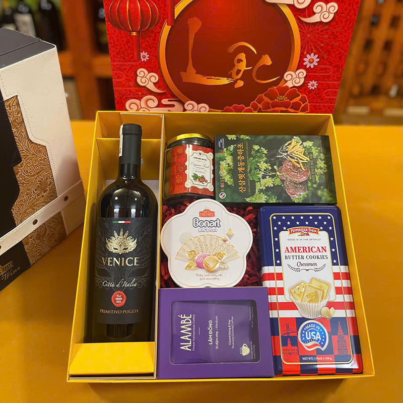 - Sản phẩm nhập khẩu chính hãng: Rượu vang nhập khẩu nguyên chai, rượu Sâm Ngọc Linh, rượu mạnh đều là hàng cao cấp có giấy tờ nguồn gốc xuất xứ đầy đủ. Từng hộp bánh, kẹo, socola trong từng set quà đều đảm bảo chất lượng đạt chuẩn.