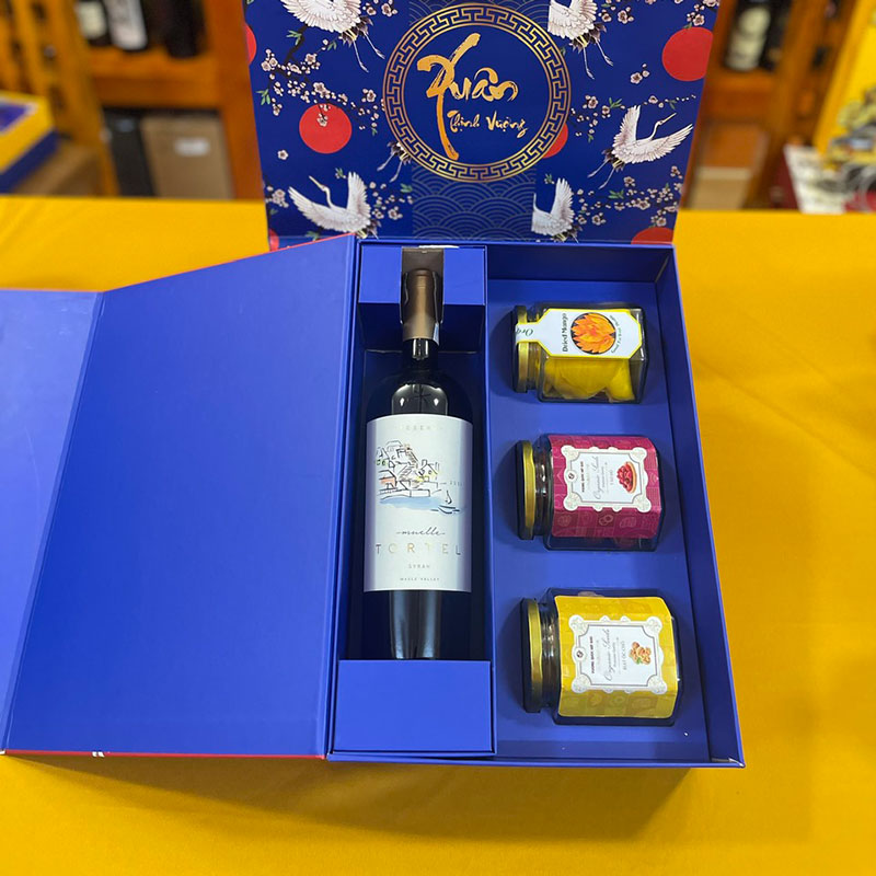 Hộp Quà Tết Cao Cấp – PV47 là sự hòa quyện tinh tế giữa hương vị rượu vang Chile Tortel Syrah đậm đà và ba hũ hạt dinh dưỡng mang ý nghĩa an khang, sung túc. Một món quà vừa hiện đại, vừa ấm áp, được Phố Vang Legend thiết kế riêng cho mùa Tết Nguyên Đán, tượng trưng cho sự trọn vẹn và thịnh vượng đầu xuân.