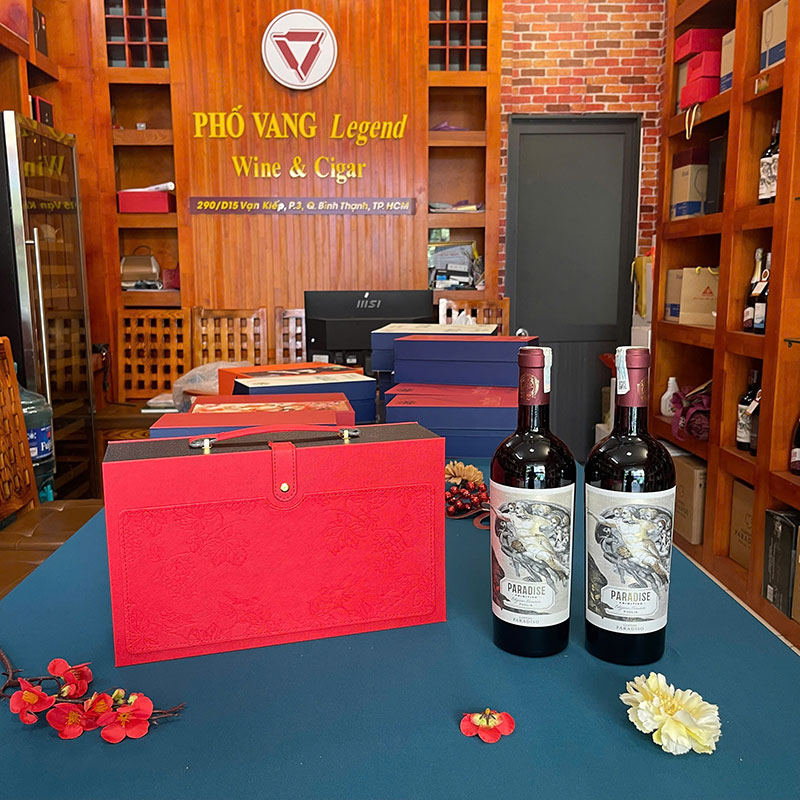 Sự góp mặt của hai chai vang Paradise Primitivo nhập khẩu chính là điểm nhấn, mang đến hương vị sâu lắng, phù hợp với không khí ấm cúng của Tết truyền thống.