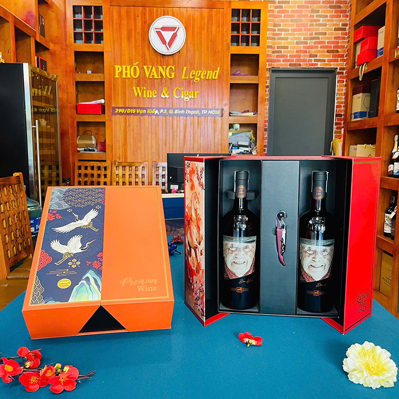 - Thiết kế: Hộp quà vẫn giữ họa tiết Á Đông (Hạc/Sơn Thủy), nhưng PV08 nhấn mạnh vào sự cổ điển, nền tảng – tương ứng với giá trị di sản của vang Don Antonio. Màu sắc (Đỏ Đô/Xanh Rêu) thể hiện sự vững chãi, trầm lắng của người lãnh đạo.