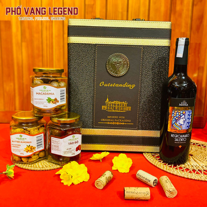 - Hộp quà rượu vang đỏ: Chọn một chai rượu vang đỏ phù hợp với sở thích của người nhận. Rượu vang đỏ thường có hương vị đậm đà và cân bằng, thích hợp cho những bữa tiệc Tết hoặc thưởng thức vào những ngày đầu năm mới.
