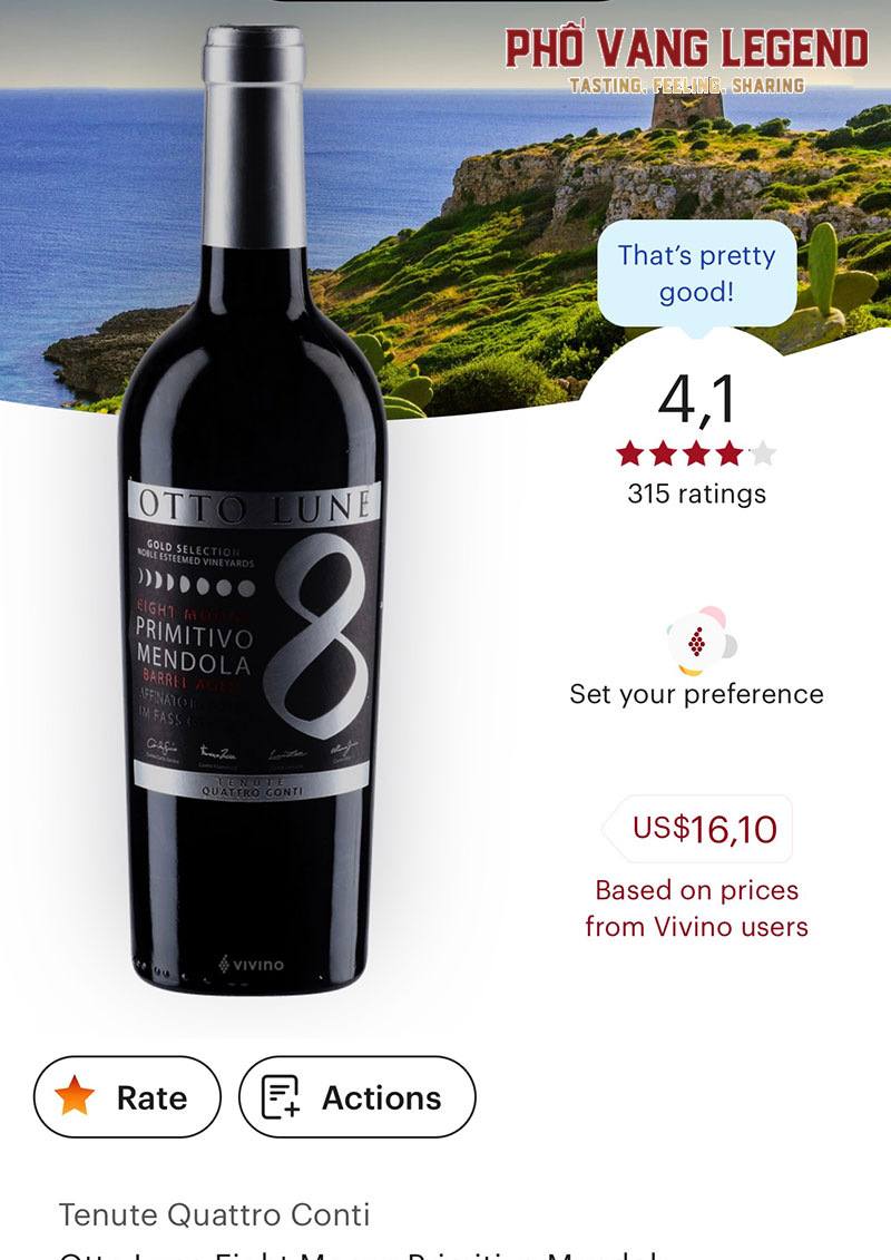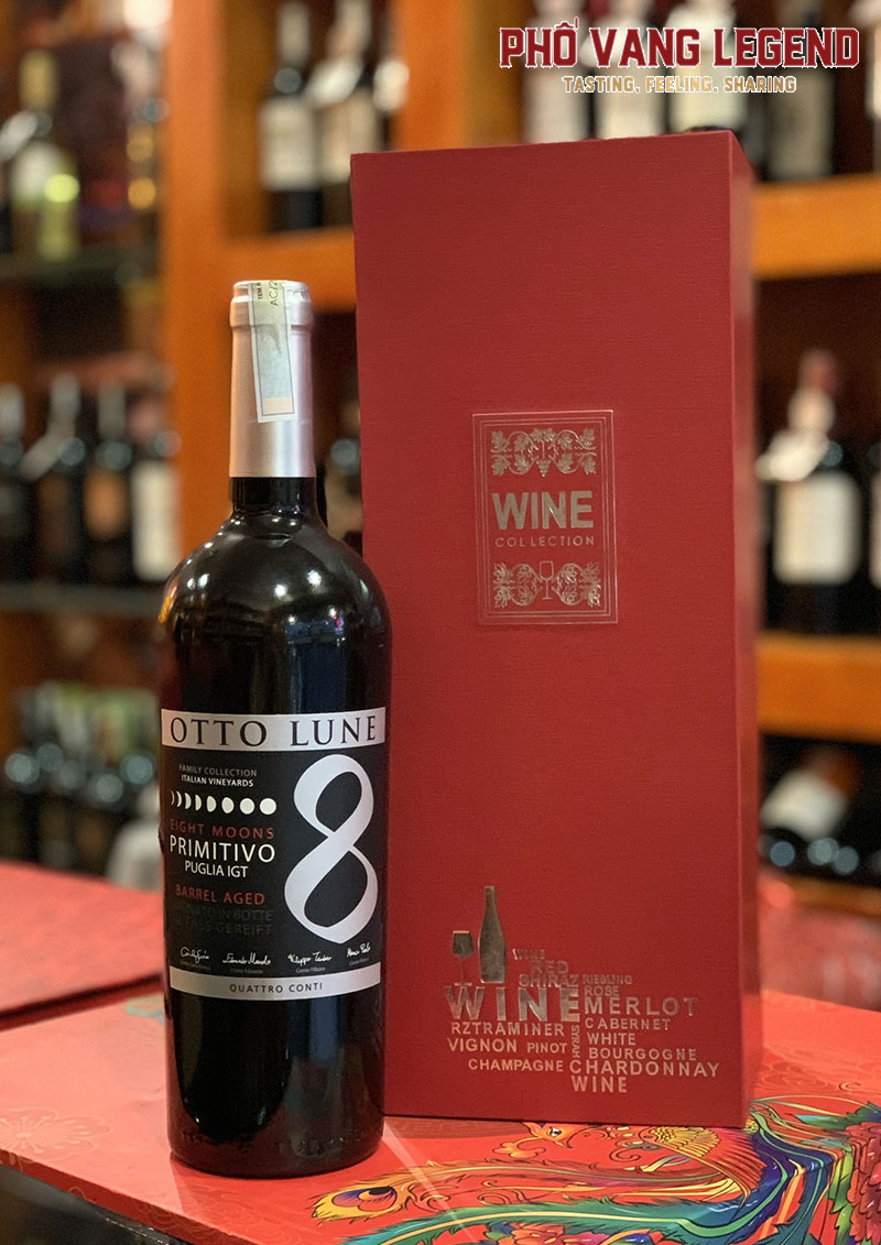 Sự kết hợp giữa truyền thống và sự đổi mới xung quanh Salento. Otto Lune – Số 8 in trên nhãn chai tượng trưng cho 8 mùa trăng mà nho Primitivo trưởng thành trong thùng gỗ sồi, đem đến một dòng vang lịch lãm và quyến rũ. Otto Lune 8 Eight Moons Primitivo Mendola – 8 mùa trăng – 8 tháng ngâm ủ trong thùng gỗ sồi già “Barrel Aged” làm rượu gợi dậy lên hương thơm của vani, socola… tạo thành bức tranh hoàn mỹ, khung cảnh thơ mộng được gói gọn trong khoang miệng.