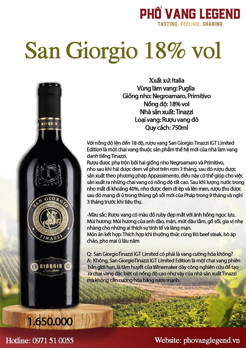 Rượu vang 18 Độ San Giorgio Tinazzi IGT Limited Edition là một chai vang thuộc sản phẩm thế hệ mới của dòng vang danh tiếng Tinazzi. Dưới thời tiết nắng nóng của Puglia, tùy khi hậu từng năm mà giống nho Primitivo có thể đạt lượng đường vô cùng cao. Chai vang được pha trộn bởi 1 giống nho Negroamaro và Primitivo, nho sau khi hái được đem về phơi trên rơm 3 tháng, sau đó rượu được sản xuất theo phương pháp Appassimento điều này có thể giúp cho việc sản xuất ra các chai vang có nồng độ rất cao. Sau khi lượng nước trong nho mất đi khoảng 40%, nho được đem đi ép và lên men, rượu thu được sau đó mang đi ủ trong thùng gỗ sồi mới của Pháp trong 9 tháng. Sự kết hợp của 2 giống nho Negroamaro và Primitivo vùng Puglia sẽ đem lại cho rượu vị đậm đà nhưng rất mượt mà, chát dịu, vị ngọt nhẹ, rượu có cấu trúc chặt chẽ và cân bằng.